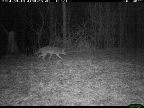 We've started off strong this year with three pictures in March. Two of the picture are of the same coyote with two different cameras. The other caught the coyote walking through one of our food plots in the field.