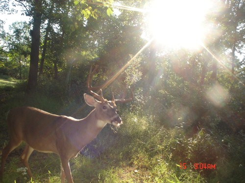 What is our take-away from this year and how did we rate our overall food plot performance. We feel the lime and fertilizer we added did a lot of good. We saw some poor plots come back and produce some decent clover and we saw our better plots thrive. We'll surely do the same next spring. We know the acreage we lost to the pipeline didn't help us, but we hope it's short term pain for long term gain. We look to pick up a real nice food plot that bisects a wooded area that the deer should love. On the other hand the lime and fertilizer we added helped our remaining plots help cover for those we lost. What's in store for next year? With the pipeline planted in clover and alfafa we're thinking about putting some of our older plots in summer annuals for variety. Which ones and how many, we're not sure. Right now the lower portion of the front field, Area 7 and the old house plots come to mind. We'll also need to do something with the two areas we have oats in right now......probably clover. Our Favorite Pictures We get thousands of pictures each month with our digital trail cameras but we narrow down each set of pictures to our favorite six or seven and these are usually buck pictures. As you can imagine there are always several more that are very good but don't make the cut. Below is one of our favorite pictures from 2014. Sometimes the sun gets involved in our pictures depending on which way our cameras are pointed. This picture didn't make our pictures page, but I liked the picture. How about the sun's rays coating this nice buck. You can take a look at our favorite deer pictures from October 10th here.