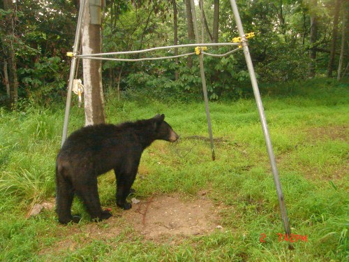 Black Bear Problems Again Last fall in our Food Plot Journal we talked about our black bear problems. Well, we had more problems again this summer. Once again a black bear took out all three feeders. For some time he stayed away from the feeder at Whippoorwill, but he finally found it and ruined it. We now have three feeders back out and we watch them close to see what happens the next time yogi visits. Ryan put bucket feeders high in the air suspended from pulleys and ropes from trees. Now the challenge is to get something bigger than a bucket high in the air. I'm curious to see if we catch a climbing bear. This is a picture we got before the bear knocked the feeder over.