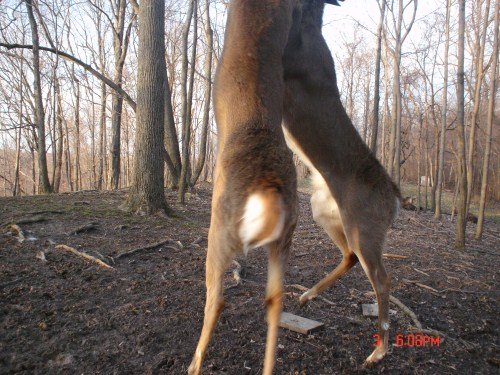 We get thousands of pictures each month with our digital trail cameras but we narrow down each set of pictures to our favorite six or seven and these are usually buck pictures. As you can imagine there are always several more that are very good but don't make the cut. Below is one of our favorite pictures from April. These deer may look like they're dancing, but I would say they are having a little scuffle. You can take a look at our favorite deer pictures from April 30 here.
