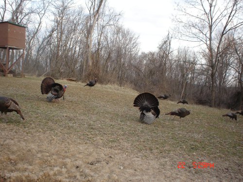 We get thousands of pictures each month with our digital trail cameras but we narrow down each set of pictures to our favorite six or seven and these are usually buck pictures. As you can imagine there are always several more that are very good but don't make the cut. Below is one of our favorite pictures from March. We get a lot of pictures of turkeys and I don’t feature many of them. I also don’t have a separate turkey picture page. I have coyote, bobcat, fox and black bear picture pages but no turkey picture page. To keep the turkeys from feeling left out here is a group of turkeys including two fanned out gobblers.