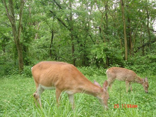 Here are two deer eating in the plot. You can see the clover bloom in this picture.