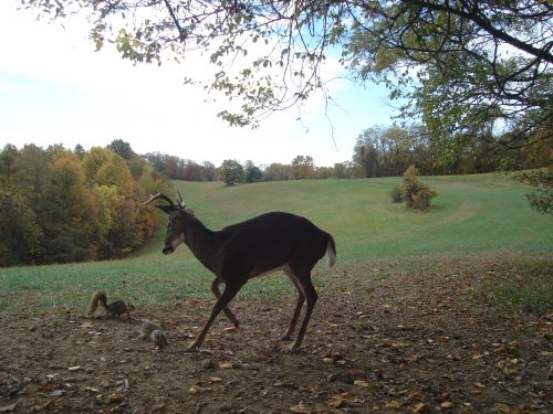 We get thousands of pictures each month with our digital trail cameras but we narrow down each set of pictures to our favorite six or seven and these are usually buck pictures. As you can imagine there are always several more that are very good but don't make the cut. Below is one of our favorite pictures from October. When the apples are falling sometimes even the squirrels have to be brave and take on the deer.