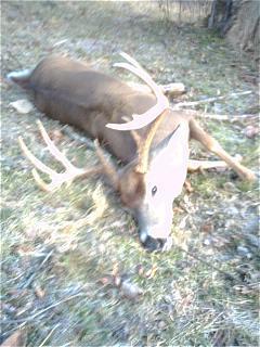 Well it was January 2,2010. The night before I called my brother in law to see if he was hunting. He said yes and about 5 min he called me back and said no he was a little under the weather to go ahead and hunt in his shooting house. I arrived at about 5:15am and got settled in by getting the heater going. It was about 7 degrees. I thought it was going to be another day of watching the does grazing about daylight. Daylight came and no does. At about 7:30am I saw movement out the west window. It did not take me long to see that this was a shooter. At 148 yards, my buck was standing broadside and I lifted my .270 Savage(old faithful). I took a deep breath and BANG he dropped to the ground. After some quiet yeah's and all rights I took a walk to see my 9 pointer, 18 1/2 in spread. Then loaded him up and started calling my family. Thanks to my under the weather brother in law for not hunting.