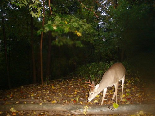 October 14th Whitetail Deer PhotographsOctober 14th was the first day of bow season here in West Virginia. Ryan and I were out early and Ryan shot a nice doe. Our digital game cameras had showed us that deer were spending time at one of our mineral licks and food plots. Ryan picked his spot and was rewarded with a shot at a doe that was leaving the food plot and heading towards the mineral lick. Once again we didn't catch any wondering bucks that we hadn't caught before and we didn't even see others that we had pictures of previously. I'm thinking they should start traveling more soon. There is still one spike that had velvet on his "antlers" as of October 11th. It looked as though it was loose so he may have shed but it wouldn't surprise me if he still has the velvet next week. We got one real interesting picture this week and I'm not real sure what it is. Take a look at the second picture below. These pictures were taken with our Woodland SpyCam, EagleEye, homemade WhitetailCam and a Trail Watcher 2060.