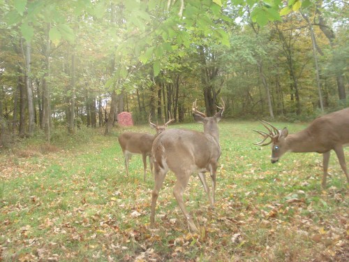 Other than one camera that is having a problem we had a good camera week and we got a lot of pictures of our bucks. We even picked up an eight point that we hadn't seen before, but he's a couple of years away. He did seem to be ready to challenge our bucks though. The picture we included of him shows him with two of our other bucks. He tried to push them both around right in front of our camera.