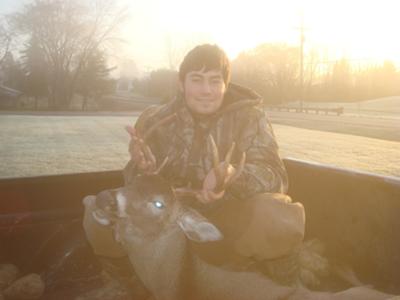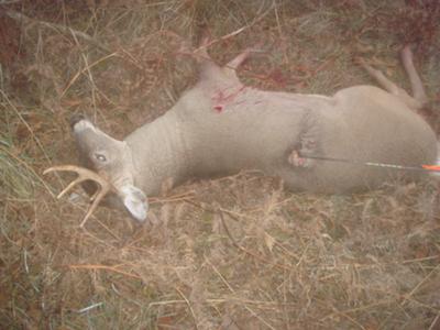 It was a foggy warm morning and I was late out to the stand. I jumped some deer when I first got out to my stand. After setting for about half an hour one of my regular spikes come in shortly followed by my regular 5 point. They started locking horns on and off while working the scrape I am set up on. Then we heard a crash to the left and I looked over, I could see a green orange arrow bobbing around the field, then he put his head up. Coming right in to check out the noise was a nice 8 point I have never seen here before not only that but he has a arrow shot into his back. I waited unto he was within range and turned sideways and shot my crossbow. The arrow went right through the heart and lungs he ran less then 30 yards before expiring. 11-9-10 Chris.