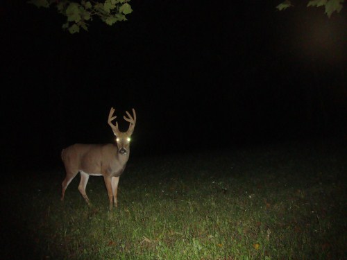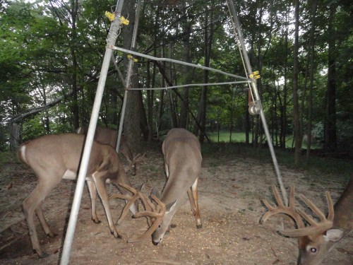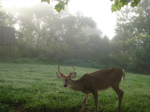 All of the bucks still have velvet, but we did get one picture of a small buck with shed velvet. It's a little four point if we give him a little.