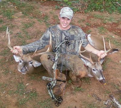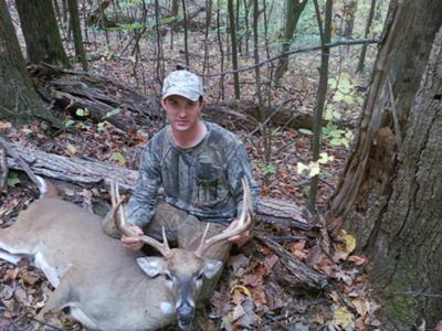 I was hunting the morning on October 25th 2010. I saw two doe at about 8:20 and then I heard some bucks spar. About 25 minutes later at about 8:45 I saw a deer about 40 yards away it was the seven point it came to 21 yards perfectly broadside and I shot it. About a minute later the 9 point comes walking in and actually stepped right where I shot the seven point at and I shot him too. It was a pretty cool experience I have to say. I will probably never again take two bucks in one hunt with a bow.